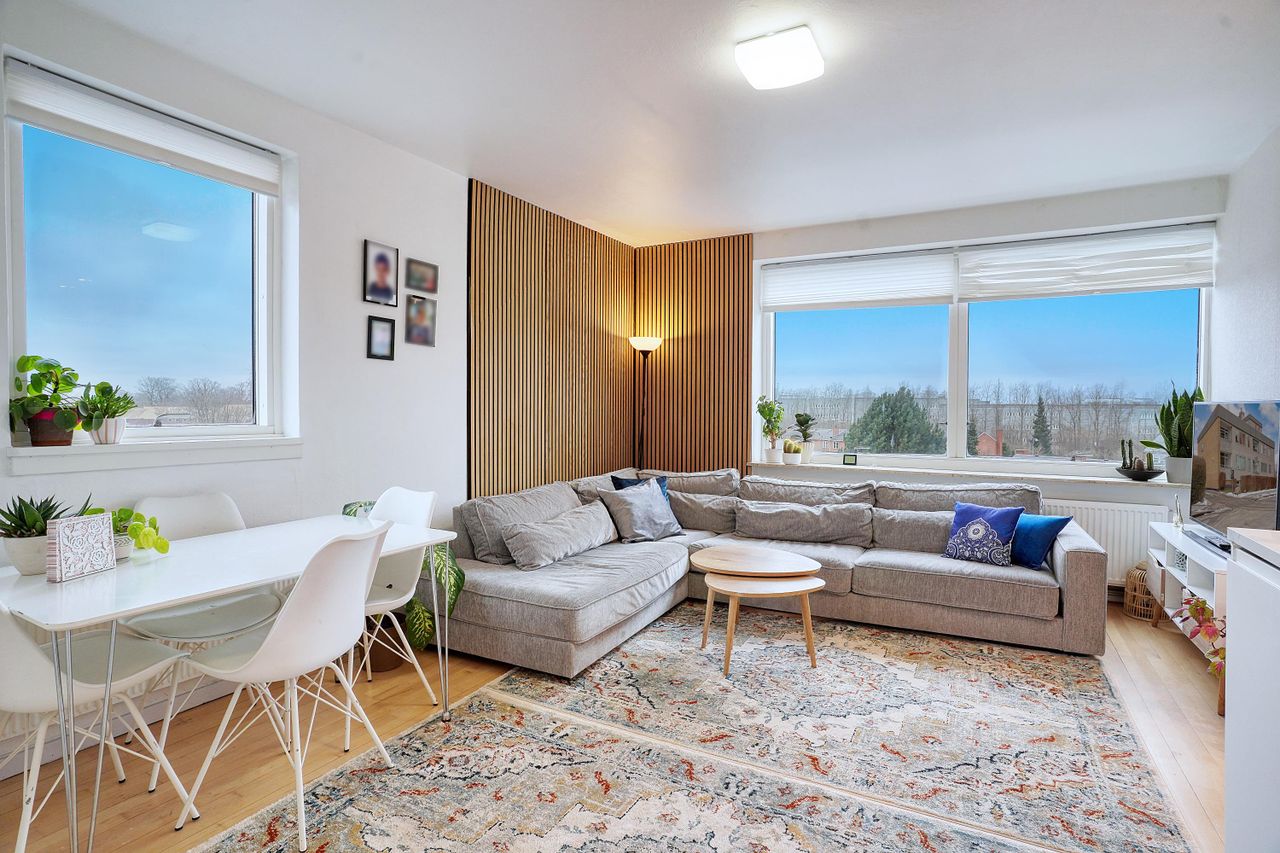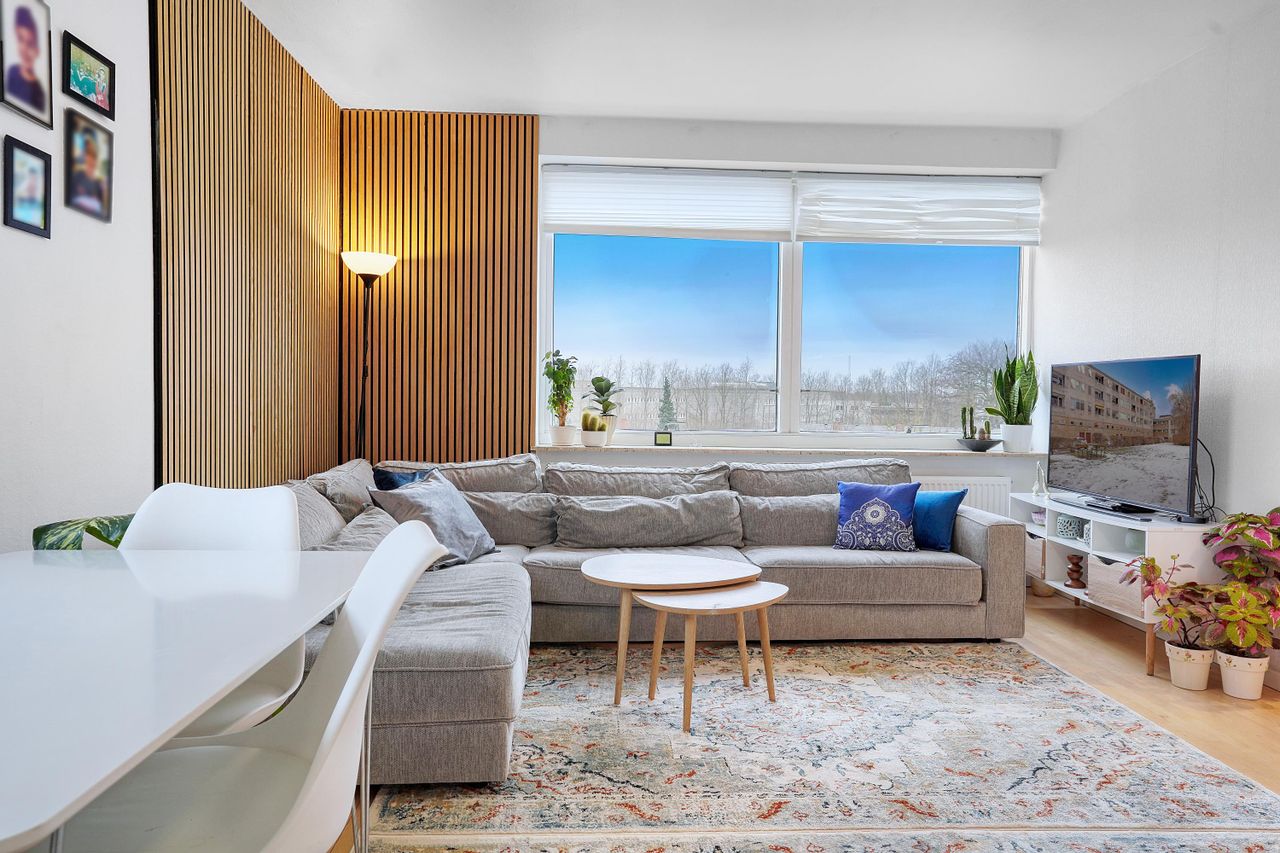 Stuen er lejlighedens naturlige samlingspunkt og imponerer med store vinduespartier, som sikrer et skønt lysindfald samt en fabelagtig udsigt – her kan solnedgangen nydes i fulde drag. Fra stuen er der adgang til to værelser. Soveværelset har god indbygget skabsplads, mens det andet værelse er mindre og ideelt som kontor, gæsteværelse eller børneværelse.